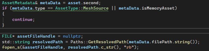 While looping through all of the assets we have I skip MeshSource (FBX) as they are never used outside of the editor, and MemoryAssets as they are defined in code and have not asset file.