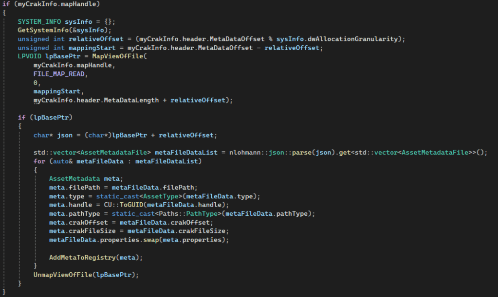 Mounting is the act of reading the header, verifying the that it is the correct format and version, and then reading the metadata to populate the asset table. For this I used memory mapped to get the data in to memory as fast as possible single threaded. Here I ran into the problem of memory mappings needing to be aligned to the allocation granularity I and I started to re-evaluate me initial thought of using mapping each asset into memory separately.